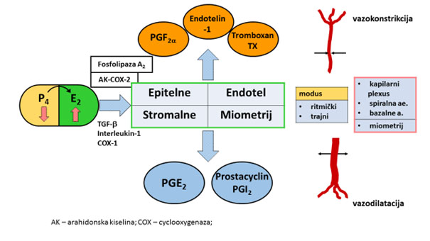 Na funkciju endometrija i miometrija značajno utječuju prostaglandini, troboxan i endotelin-1. Aktivnosti su na vazodilataciju, vazokonstrikciju i glatko mišićje, te imaju posebnu važnost u fiziologiji i patofiziologiji krvarenja iz uterusa (menstruacija, NKM). Povezani su i s bolnim menstruacijama – dismenorejom. Tromboxan je najsnažniji vazokonstriktor, a PGI2 je potentan vazodilatator. Balans između te dvije aktivnosti ima snažnu kontrolu menstruacije, posebno u početku i zaustavljanju krvarenja. Izraženo je konkurentno, oponirajuće djelovanje PGF2a/PGE2 i TX-Endotelin/PGI2. Te su aktivnosti određene i trajanjem (polu-životom) njihovog učinka. Prostacyclin ima važnu ulogu (vazodilatacijsku) u trudnoći kao i protekciji od kardiovaskularnih bolesti. U endometriju su dominantni prostaglandini PGF2ai PGE2 (slika 5.).