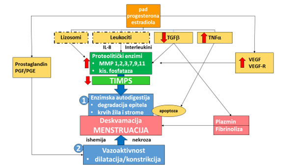 Padom progesterona (i estradiola) dolazi do niza promjena u kojih je primarna enzimska autodigestija funkcionalnog endometrija. Iz decidualiziranih stanica strome oslobađaju se inflamatorni medijatori, citokini i kemokini. Modulatori tih aktivnosti su NF-kB (nuclear factor kappa beta) i ciklooksigenaza-2 (COX-2). Glavni cilj djelovanja citokina je NF-kB. Dolazi do dezintegracije membrane lizosoma i leukocita, te se aktiviraju snažni proteolitički enzimi – matrixmetaloproteinaze (MMP) i kisela fosfataza (autokrina i parakrina proizvodnja).