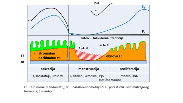 U slici 2. prikazujemo temeljne perimenstrualne promjene hormona i endometrija. Prestankom funkcije CL prekida se negativna sprega i u vrijeme menstruacije počinje porast FSH i posljedično estradiola. Počinje novi ciklus.