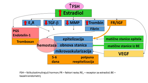 Luteo-folikularnom tranzicijom već zadnja 2 do 3 dana menstruacije raste FSH i posljedično estradiol. U bazalnom endometriju održan je i stabilan broj receptora za E2 i P4, a posvuda u endometriju se stvaraju novi receptori. Estradiol zaustavlja molekularna zbivanja kojima je odbačen funkcionalis i pomaže epitelizaciji (preko faktora rasta) i hemostaze. Tek nakon što je stvoren novi površni epitel u cijelosti, regenerira se stroma iz matičnih stanica bazalnog endometrija. Estrogeni stimuliraju ekspresiju epidemalnog faktora rasta (EGF), produkciju IGF-a i obnovu endometrija.