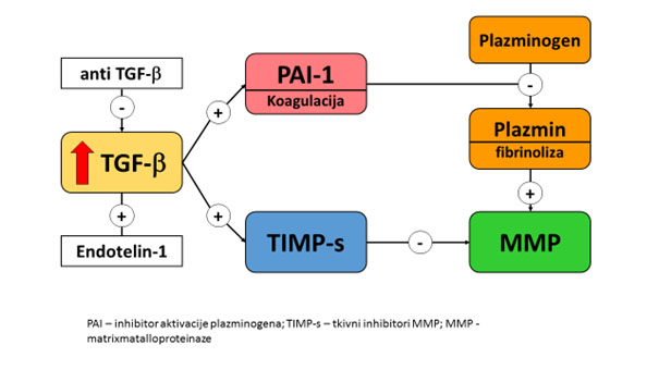 Važnu ulogu u hemodinamskim i enzimatskim zbivanjima u funkcionalnom endometriju ima obitelj citokina TGF-bi njihova kontrola. Porast progesterona i estradiola stimulira aktivnost tog citokina, a pad tih hormona inhibira TGF-b. Povišena aktivnost TGF-bpotiče PAI-1 i koagulaciju uz umanjenu fibrinolizu, a stimuliranjem TIMPS-a, inhibiraju se MMP-e. Niska konverzija u plazmin također dovodi do supresije matrixmetaloproteinaza (slika 6.).