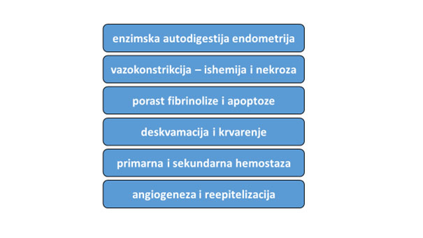 Progesteron održava ravnotežu enzima, prostaglandina i citokina u funkcionalnom endometriju. Padom proizvodnje progesterona ta se ravnoteža prekida i započinju zbivanja koja dovode do menstruacije (slike 3. i 4.). Tri su razine kontrole endometrija. Prva faza menstruacije je degradacija i deskvamacija funkcionalisa.