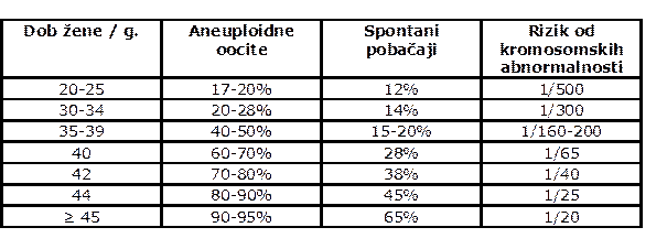 Na nisku reprodukcijsku sposobnost starenjem žene upućuju i dokazane činjenice o aneuploidnim oocitama, učestalost ranih spontanih pobačaja i kromosomskih abnormalnosti fetusa. Većina podataka iz tablice 1. dobivena je iz IVF postupaka. Učestalost je ista kao i prirodna (13).