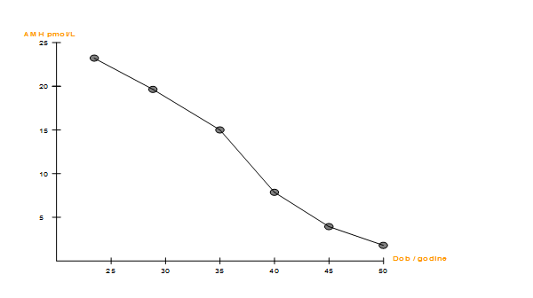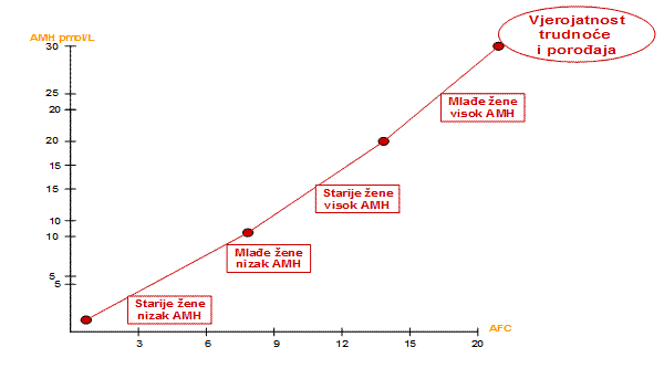 Danas se razina AMH smatra najpouzdanijim pokazateljem rezerve jajnika i plodnosti žene. Ona je sukladna dobi i broju manjih antralnih folikula, 2 do 10 mm u promjeru. Ultrazvučna pretraga broja antralnih folikula (antral follicular count – AFC) i automatsko mjerenje volumena folikula (sono AVC) koreliraju s dobi žene i razinom AMH. Te odnose prikazuju slike 5. i 6.