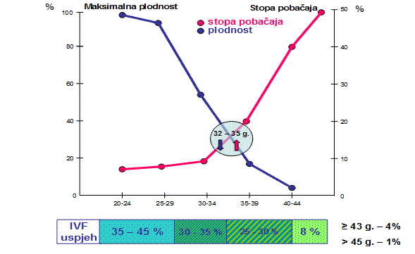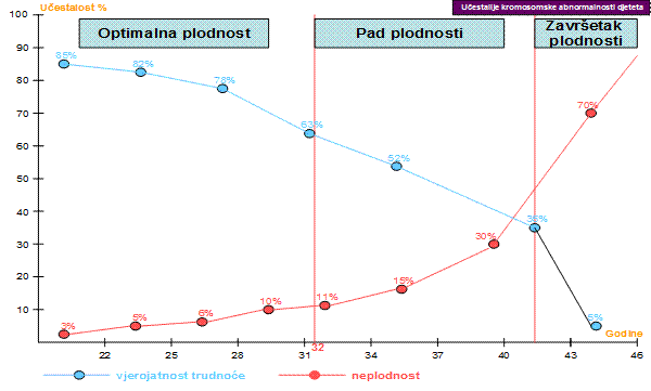 Dosadašnja istraživanja pouzdano upućuju na to da je plodnost žene u opadanju već od 32. godine, a nagli pad plodnosti bilježi se nakon 38. godine. Vjerojatnost trudnoće nakon 40. godine naglo se smanjuje na 5 do 20%.