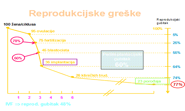 Na navedeno ukazuju nalazi brojnih istraživanja, koja su utvrdila da će se i u mladog para, bez dokazane neplodnosti, uz redovite spolne odnose dogoditi reprodukcijski gubitak od 70%. To znači da će od 100 ciklusa u 25% izostati oplodnja, a u samo 45% ostvarit će se blastocista. Najviši, oko 60%, jest periimplantacijski gubitak. Od preostalih 26 do 28 kliničkih trudnoća rodit će se 23 do 25 djece.